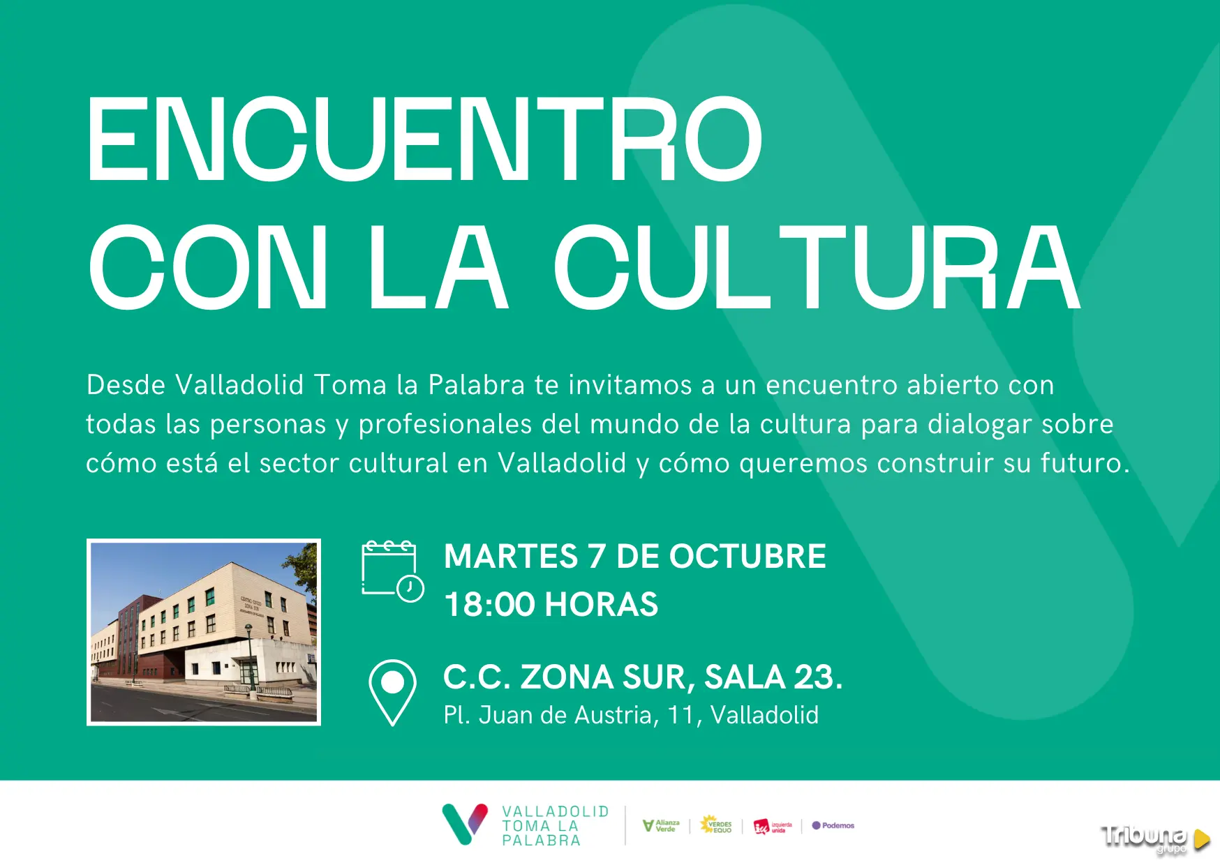 Valladolid Toma la Palabra ha convocado un encuentro abierto con el mundo de la cultura en Valladolid, que tendrá lugar el próximo martes 7 de octubre a partir de las 18.00 horas en el Centro Cívico Zona Sur. La cita está dirigida a todas las personas vinculadas al ámbito cultural de la ciudad: profesionales, colectivos, asociaciones, aficionados y público en general.