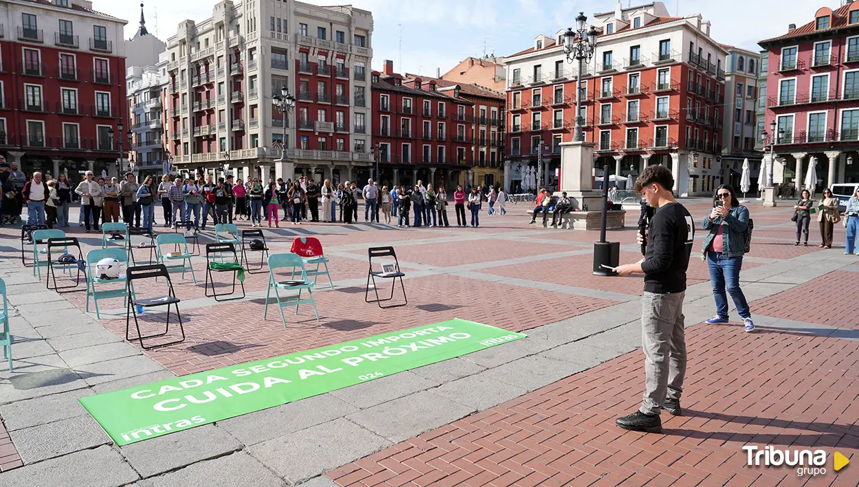 El Ayuntamiento de Valladolid y la fundación ‘Intras’ ha llevado a cabo este 8 de octubre ‘#40segundos’, un acto que forma parte de la campaña con motivo de la Semana de la Salud Mental. Durante esta acción, la Plaza Mayor se ha llenado de sillas verdes y negras, donde cada 40 segundos se levantaba una persona y dejaba sobre ellas un objeto que representaba el fallecimiento de una persona por suicidio.