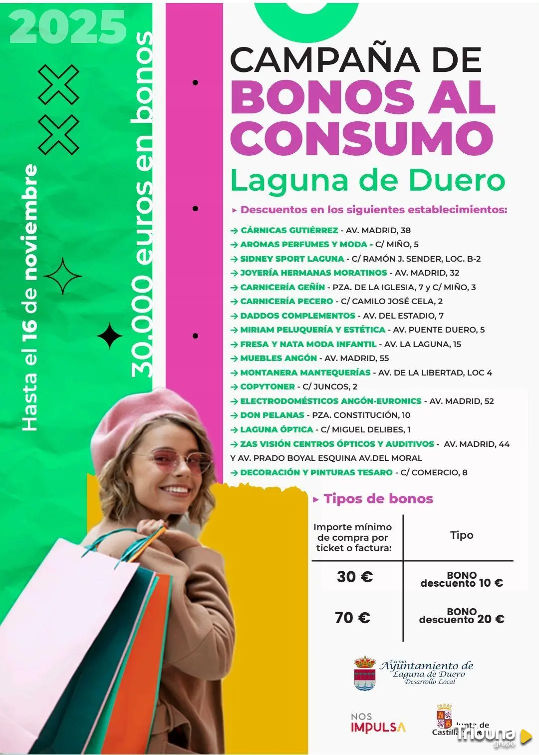 La Concejalía de Desarrollo Local ha lanzado una nueva edición de los bonos al consumo con el objetivo de impulsar las compras en el comercio local de Laguna de Duero. La campaña, que se enmarca dentro de las actuaciones municipales de apoyo al pequeño comercio, pone en circulación 30.000 euros en descuentos directos al consumidor.