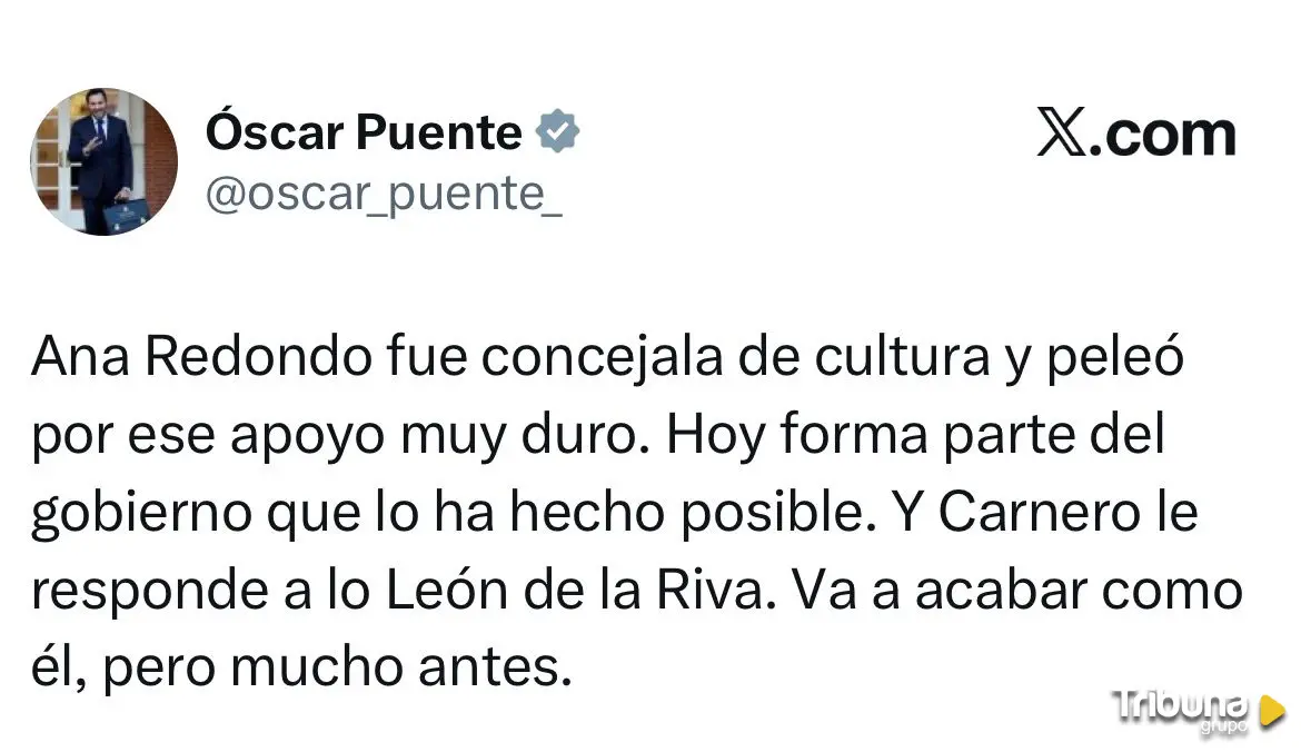 La respuesta de Puente llegó este viernes 24 de octubre, a través de la red social X, donde defendió el papel de Redondo, exconcejala de Cultura en el Ayuntamiento de Valladolid.