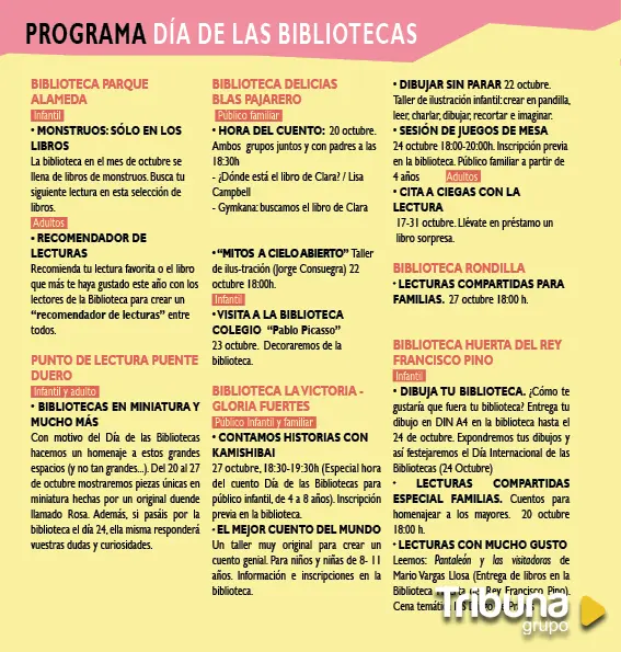 También habrá talleres para familias como la actividad intergeneracional 'Adivingo' para jugar con el patrimonio oral que todas las familias atesoran o las lecturas compartidas para familias, como la que va a tener lugar en la Biblioteca Rondilla el 27 octubre, a las 18.00 horas.