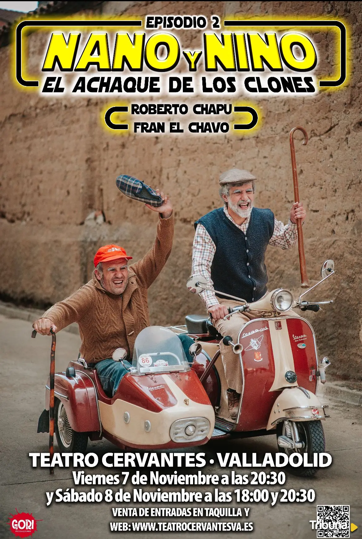 Los abuelos más divertidos, entrañables y cascarrabias vuelven a escena en Valladolid, en el Teatro Cervantes. Roberto 'Chapu' y Fran 'El Chavo' regresan con el segundo episodio de 'Nano y Nino: El achaque de los clones', una comedia que, combina el humor con la vida en soledad de los mayores en la España vaciada. Las funciones serán el próximo viernes 7, de noviembre, a las 20.30 horas y el sábado, 8 de noviembre, con dos pases, uno a las 18.00 horas y otro a las 20.30.