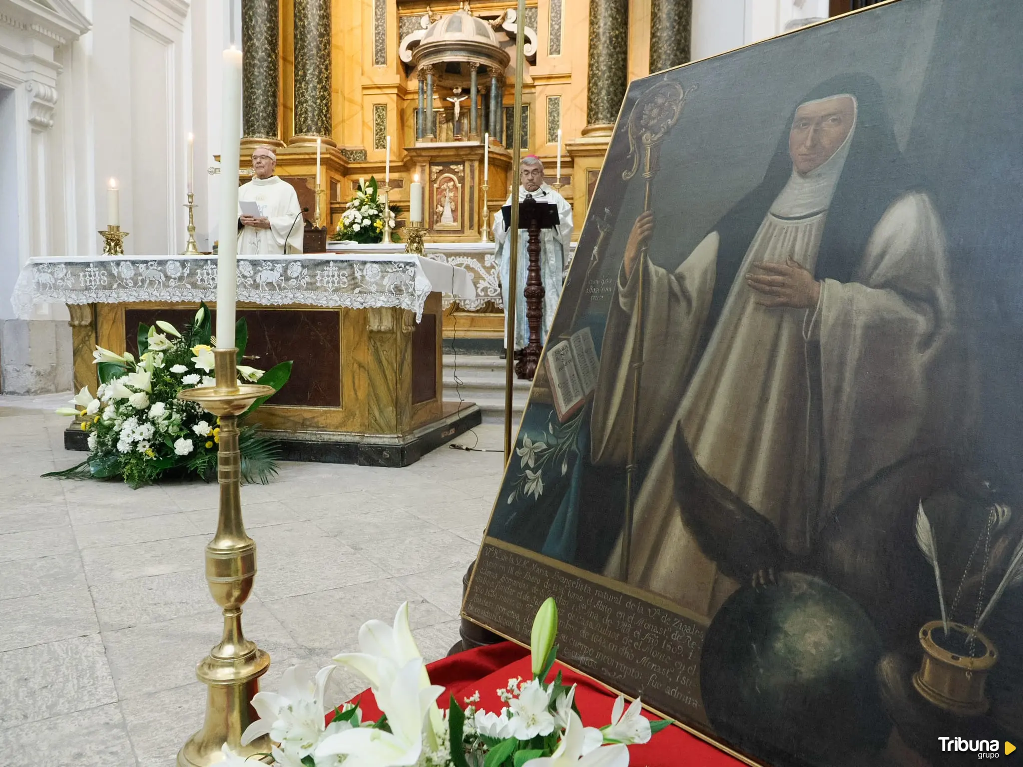 En su homilía, monseñor Argüello recordó las circunstancias históricas de esta religiosa que fue recordada con un lienzo que presidió la misa. "En el camino hacia la Santidad de María Evangelista hay humildad y humillación". Precisamente en el monasterio donde se celebró la eucaristía, la monja cigaleña vivió largos años. Recibió el sacramento del bautismo en la iglesia parroquial de Cigales, que aun conserva esa pila bautismal. La religiosa murió en Casarrubios del Monte (Toledo) en 1648, donde había fundado una nueva comunidad.