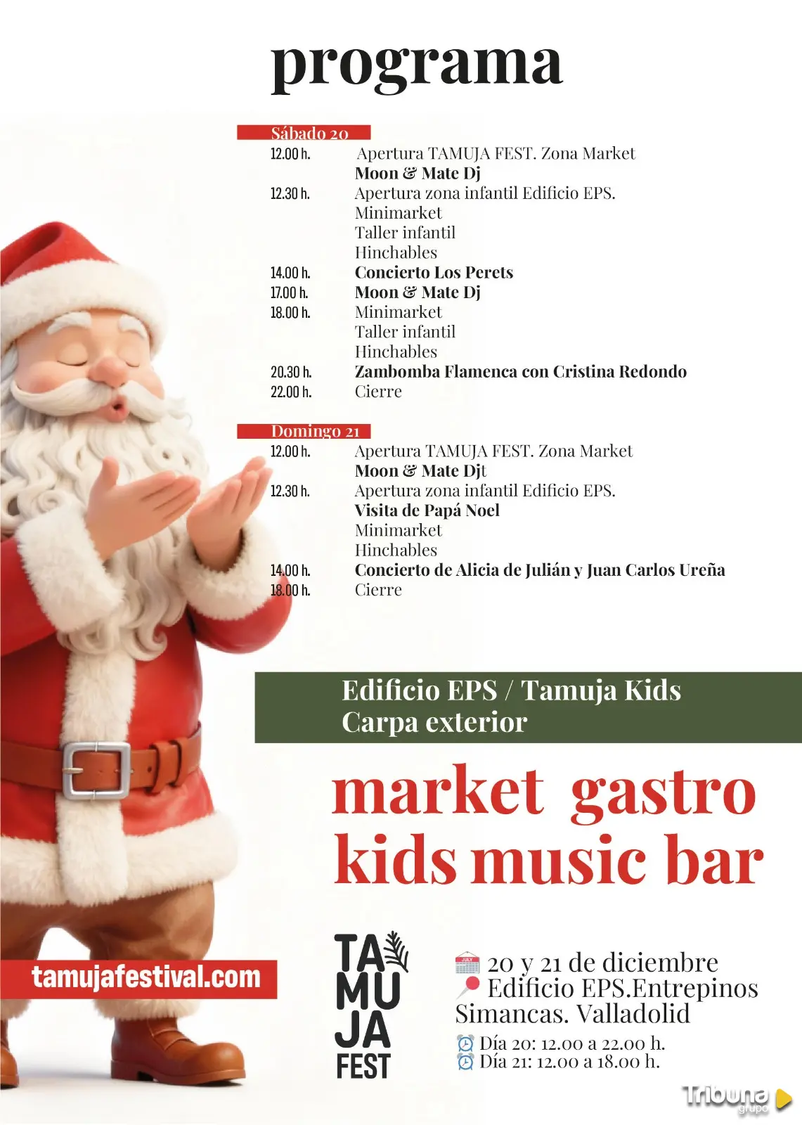 El 20 y 21 de diciembre, Simancas celebrará la edición navideña de TAMUJA FEST, un encuentro cultural que fusiona música, market y gastronomía con el espíritu de la Navidad. Tras el éxito de sus ediciones anteriores, el festival regresa a Entrepinos en una carpa exterior con una propuesta ampliada que incluye una zona de market artesanal, una zona gastronómica y los conciertos, mientras que en el Espacio Polivalente de Simancas (EPS) estará dedicado a los niños un minimarket infantil como novedad, la visita de Papá Noel, hinchables y talleres creativos.