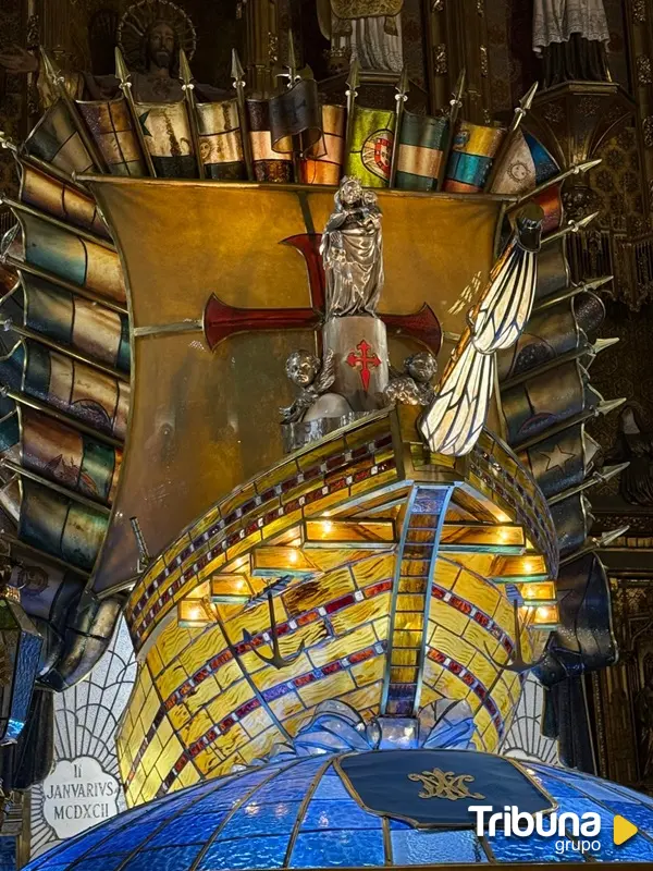 En ella, una gran carabela de cristal evoca el descubrimiento de América; la Virgen del Pilar, con la cruz de Santiago, va en la proa de la nave; y alrededor de la vela principal se ubican las banderas de todos los países latinoamericanos. Debajo, el color azul representa el mar. La parte trasera es un retablo con la Virgen sobre su columna en el cielo.