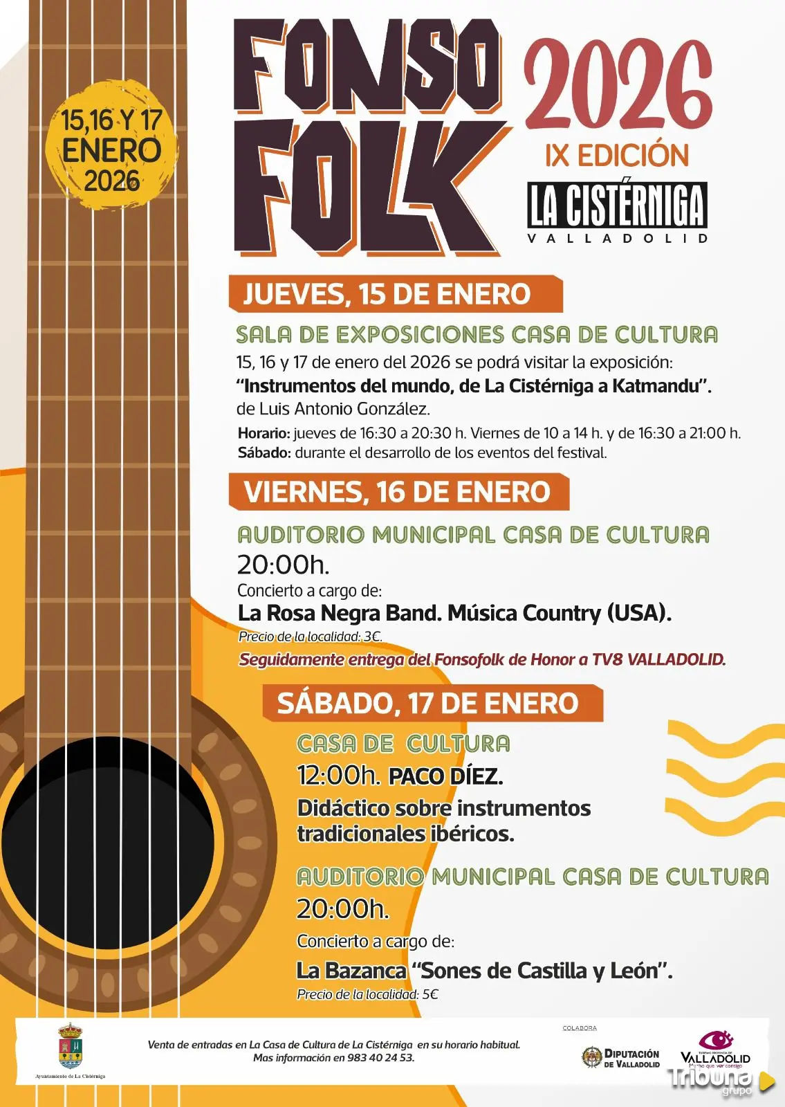 La Cistérniga volverá a convertirse en epicentro de la música tradicional y el folk con la celebración de la 9ª edición de FONSOFOLK, que tendrá lugar del 15 al 17 de enero de 2026 en la Casa de Cultura. El festival reunirá conciertos, propuestas didácticas y una destacada exposición internacional de instrumentos tradicionales, consolidándose como una de las citas culturales más importantes del año en la provincia.