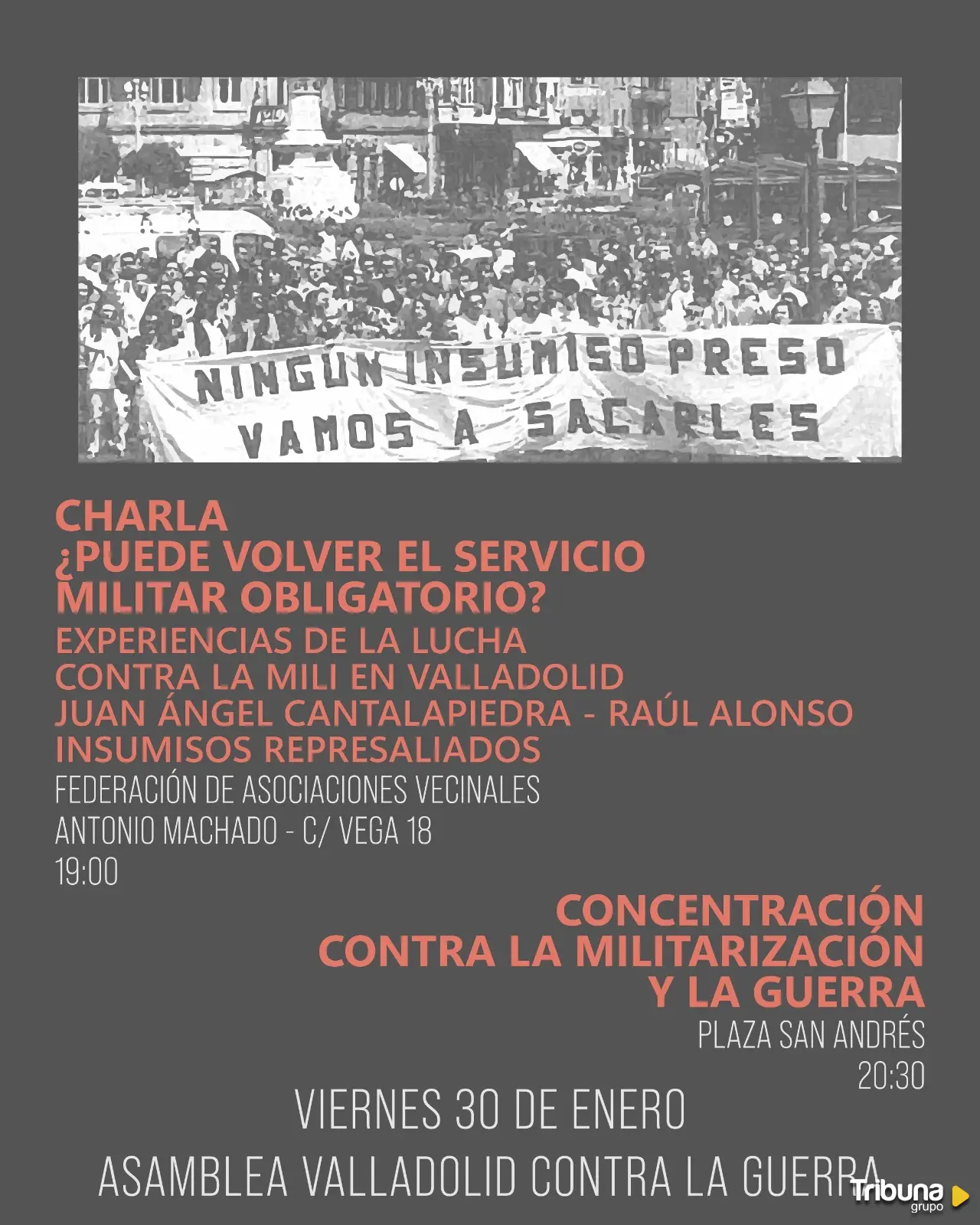 El acto contará con la participación de Juan Ángel Cantalapiedra y Raúl Alonso, activistas históricos del movimiento de insumisión en Valladolid que sufrieron represalias por su oposición al servicio militar obligatorio. Su intervención servirá para contextualizar el debate actual y recuperar la memoria de las luchas antimilitaristas en la ciudad, con el objetivo de "aportar claves de reflexión y resistencia" frente a lo que los organizadores consideran "un posible retroceso en derechos y libertades".